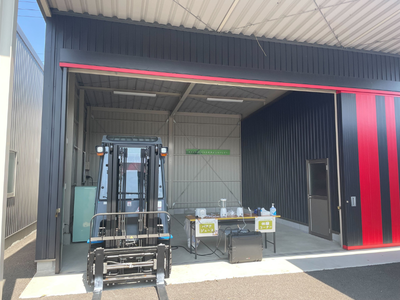 写真は、フォークリフトの試乗会&フォークリフトの電源を使用して作るバナナジュースの準備段階です