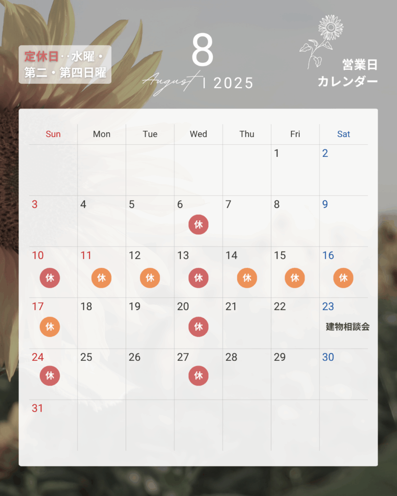 8/10(日)〜8/17(日)までの期間、夏季休業となります。