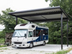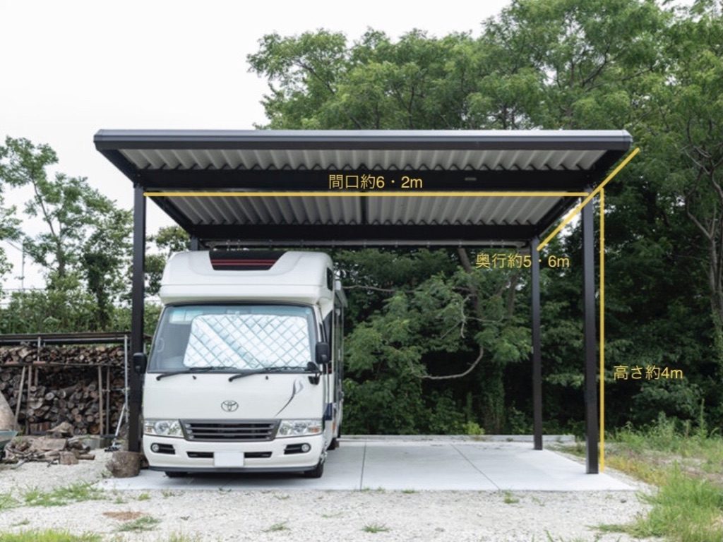 キャンピングカーもラクラク停められる高さ4mのカーポートのご紹介です。 最深積雪量2000cm 耐風圧強度34m/s 鉄骨の丈夫なカーポート オプションでサイドパネルもつけられます。