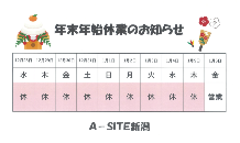 〜 こんにちは A-SITE新潟です 〜【🐯年末年始休業のお知らせ🐰】12月28日(水)〜1月5日(木)まで休業させて頂きます。尚、1月6日(金)より通常営業しております。本年も大変お世話になりありがとうござ...