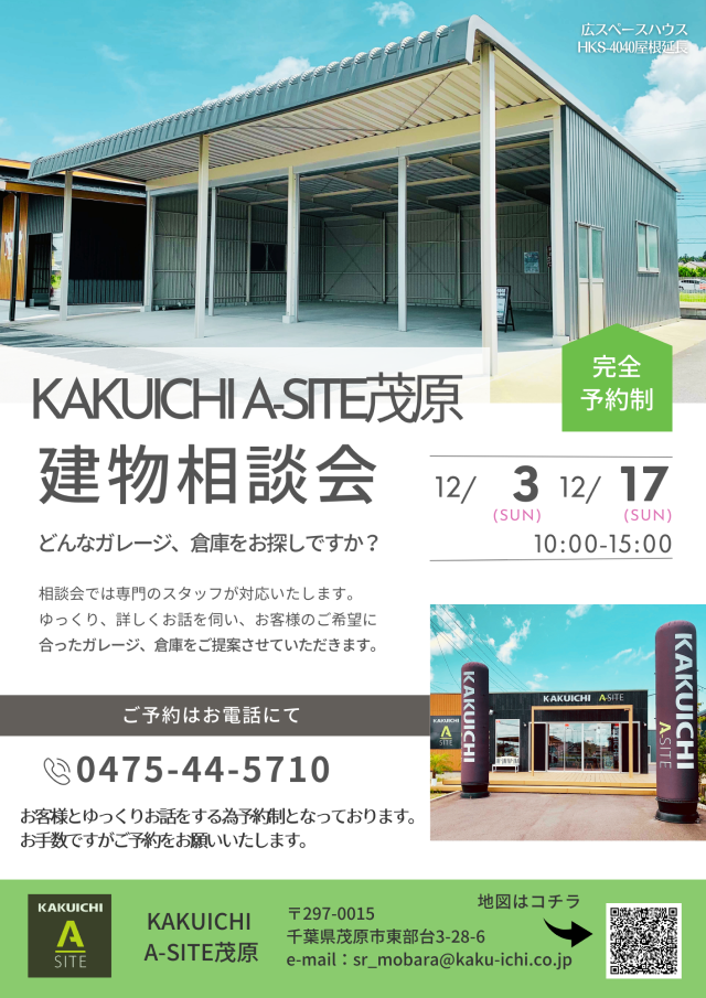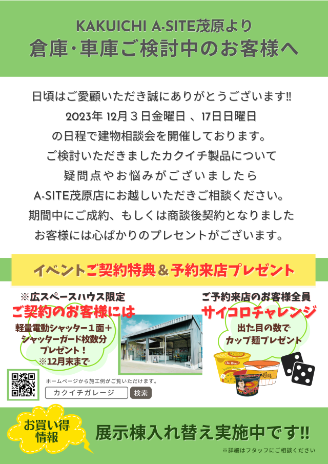 ガレージ、倉庫の展示場カクイチA-SITE茂原スタッフ渡邉です。