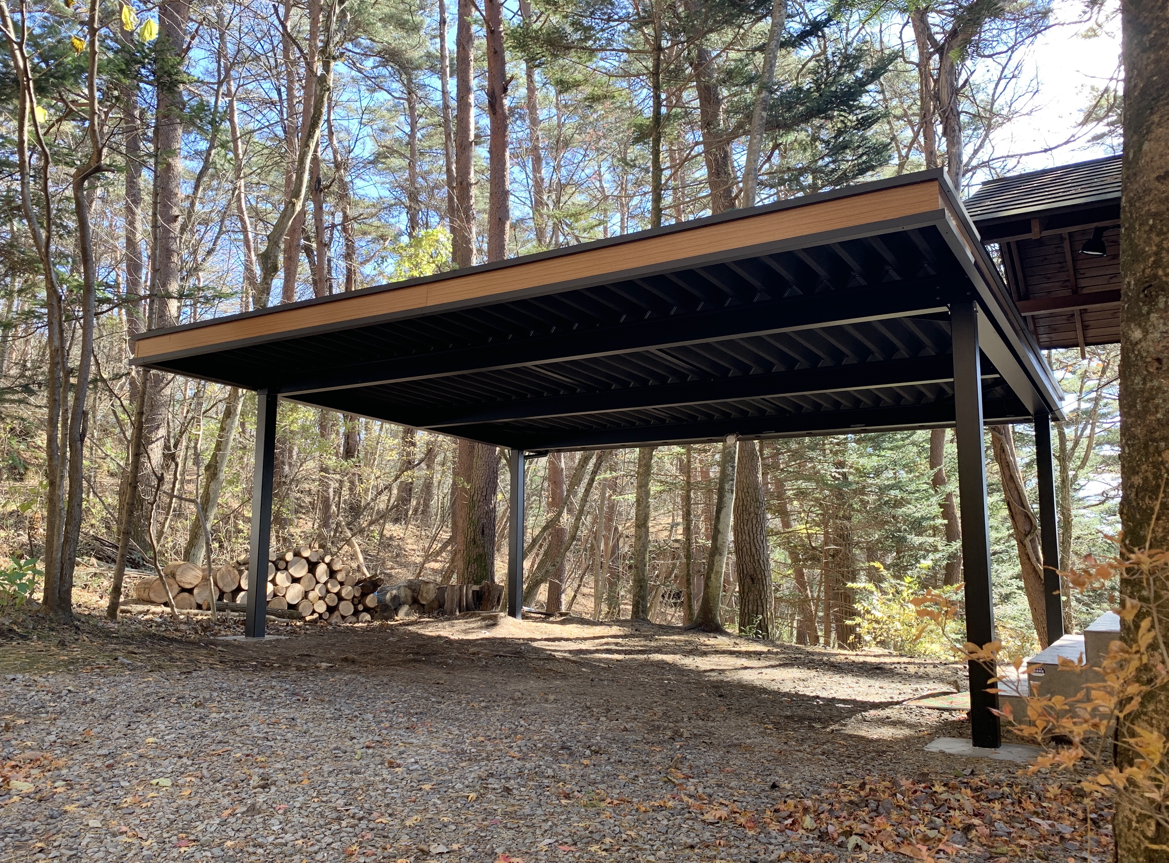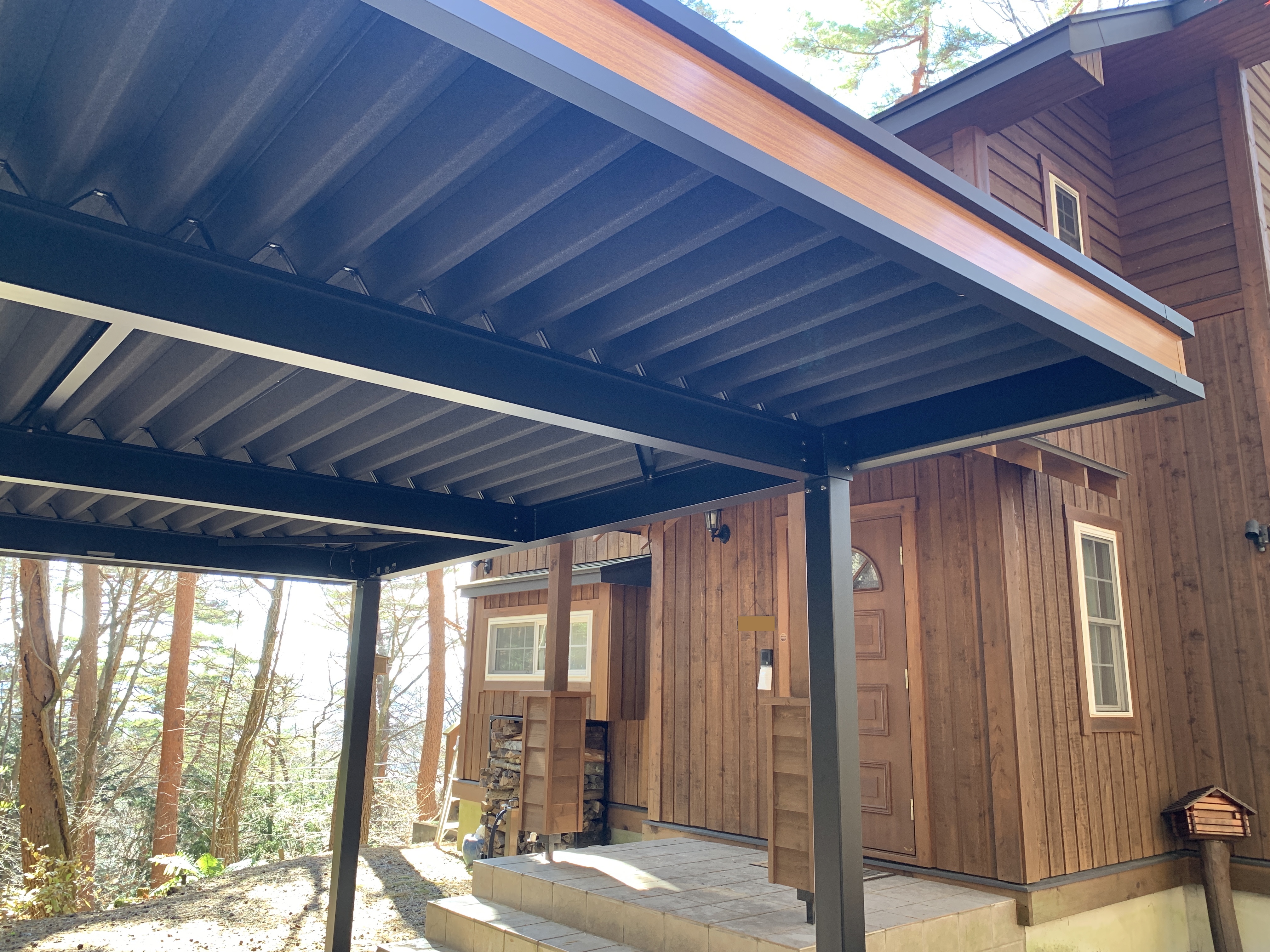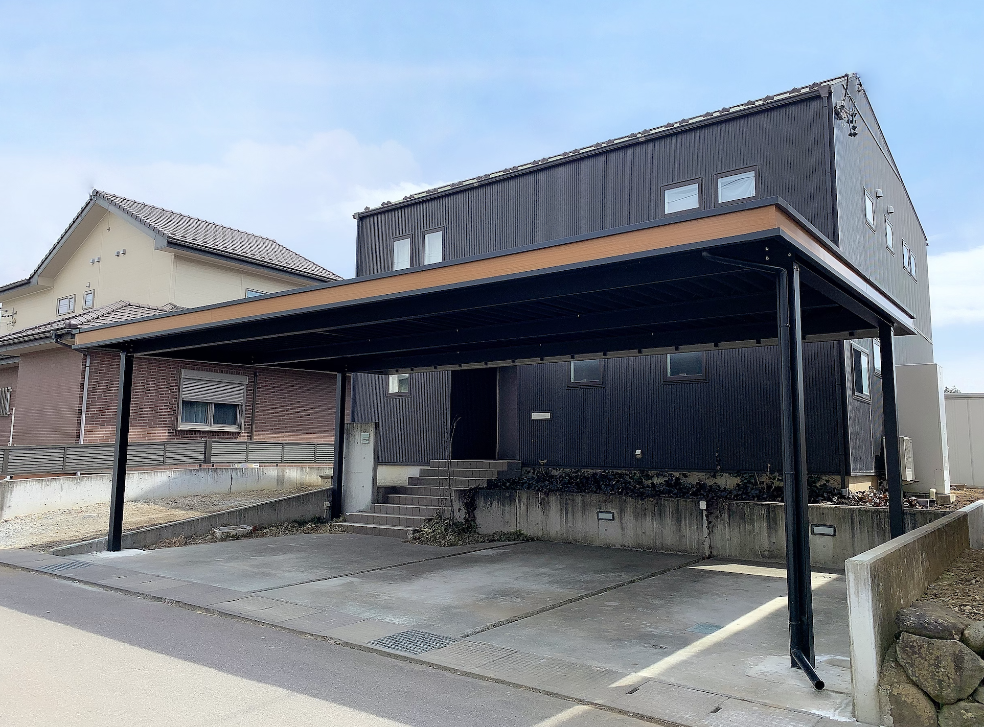 Bキャノは、サテンブラックの黒い重厚感のある鉄骨に、木目の破風を合わせたオシャレでカッコイイカーポートです。