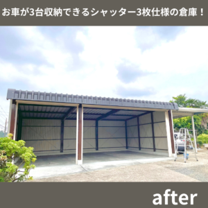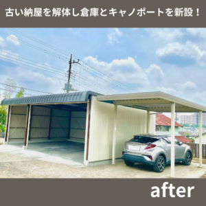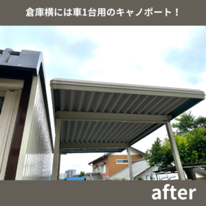 既存納屋と使い勝手や大きさはほぼ変わらずにしKSW-3031と倉庫と横下屋としてキャノポートのRG4L-3256を施工させていただきました!