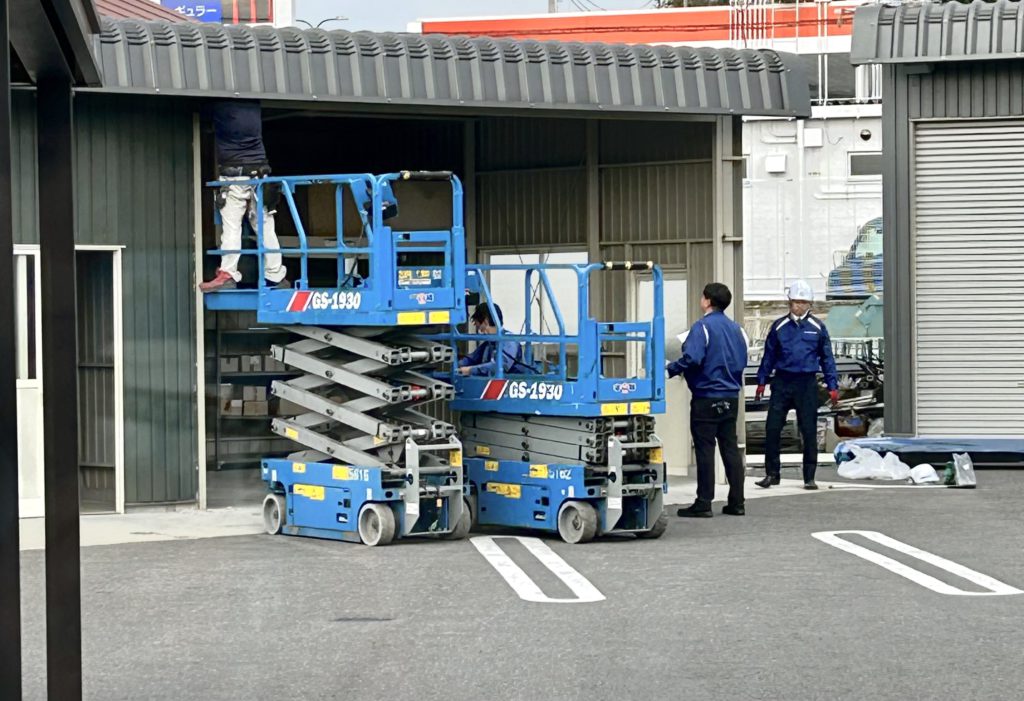 朝早くから職人さん2人が高所作業車を使い、協力しながら作業を行います。