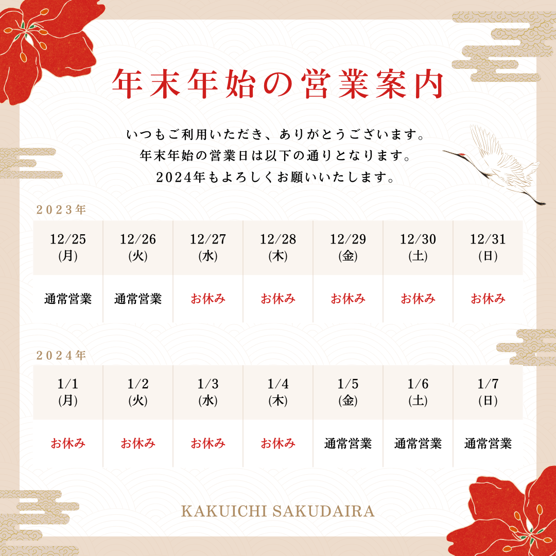 年末年始休業期間:2023年12月27日(水)~2024年1月4日(木)