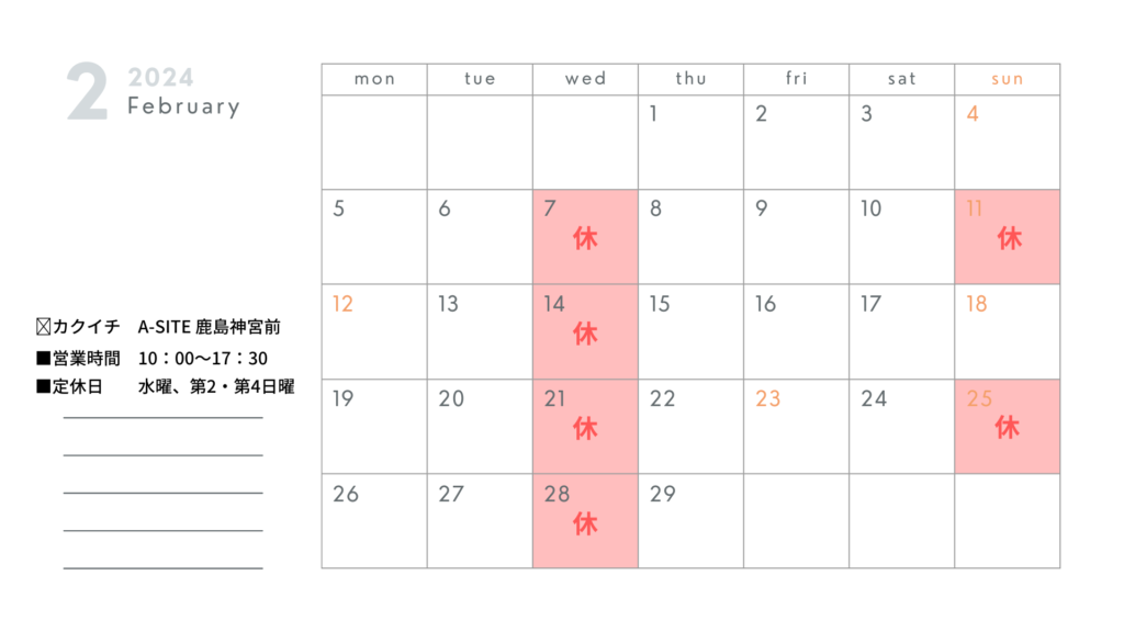 A-SITE鹿島神宮前店の2月の営業日のご案内です⛄️