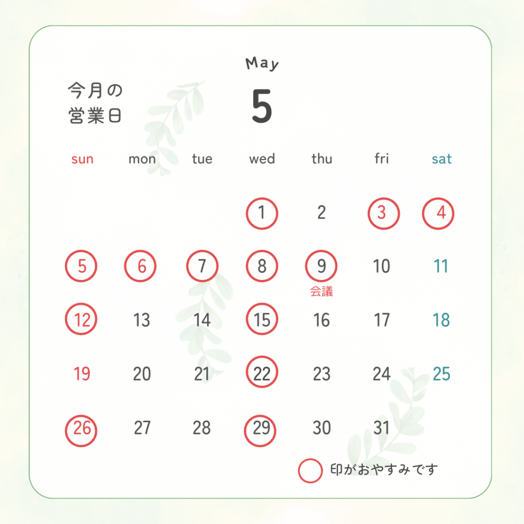 5月の営業日のご案内です。 ご来店の際は、ご確認をお願いいたします。 尚、担当者が現調等で不在の場合もありますので、詳しくご相談したい場合はお電話でのご予約をお願いいたします。