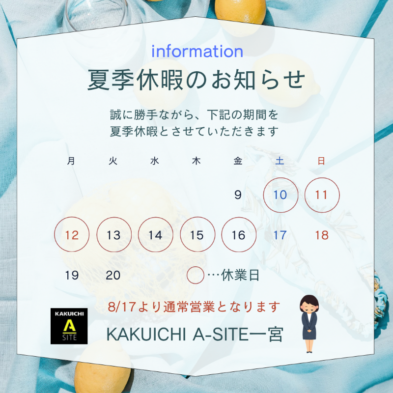KAKUICHI A-SITE一宮も明日から夏季休業させていただきます✨