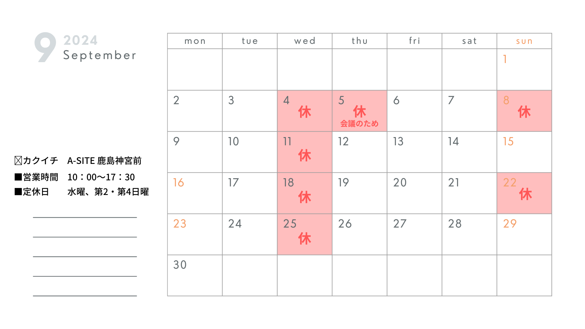 9月の営業カレンダー | カクイチ A-SITE
