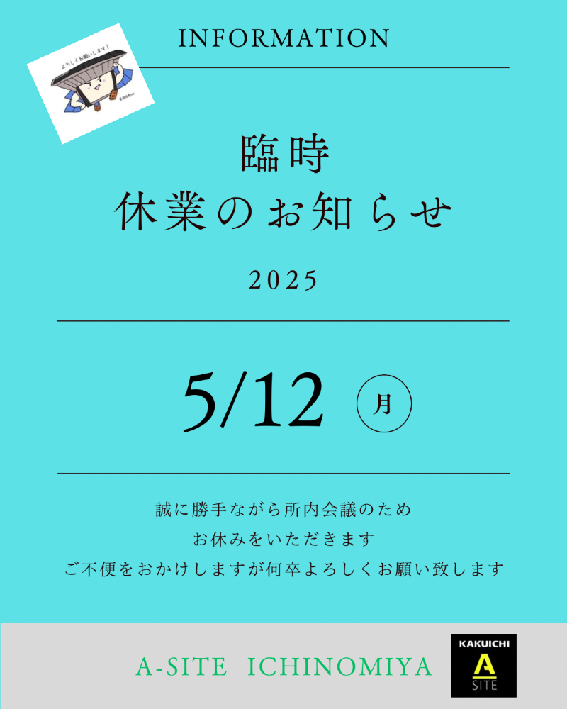 📢臨時休業のお知らせ!!大変ご不便をおかけいたします🙇 | カクイチ A-SITE