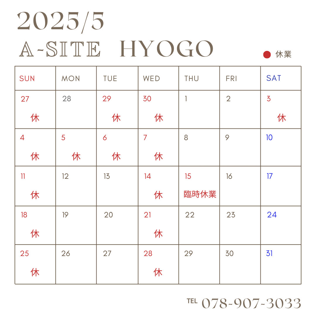 こんにちは⭐️ A-SITE兵庫は5月15日は臨時休業となります。ご注意ください