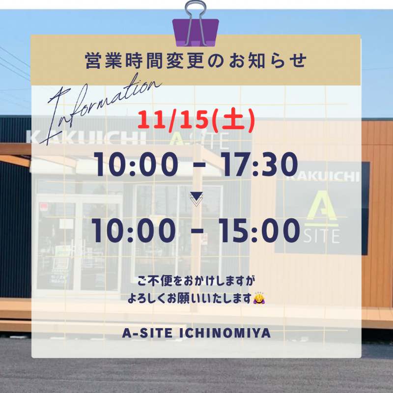 A-SITE一宮よりお知らせです!11/15(土)営業時間が変更になります🙇 | カクイチ A-SITE