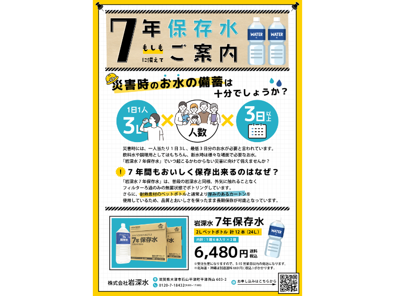 長期保存水の活用として岩深水では、 7年といった長期保存可能な保存水もご用意しております。