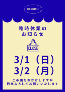 3月の営業日と臨時休業のお知らせ