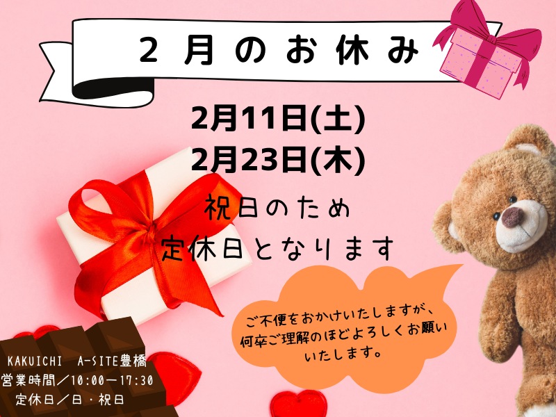 2月は11日(土)と23日(木)が祝日のためお休みとなります☀️
