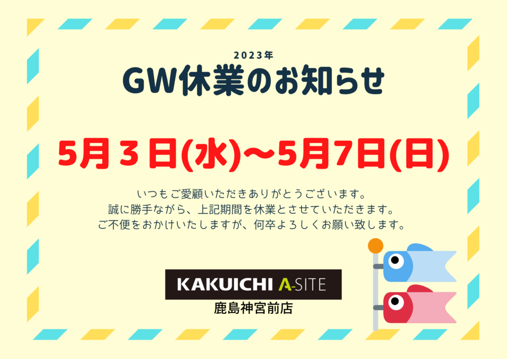 A-SITE鹿島神宮前店の5月の営業日のご案内です🎏