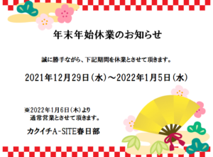 2022年も、A-SITE春日部をよろしくお願い致します! 皆様、どうぞ良いお年をお迎え下さい(^▽^)/