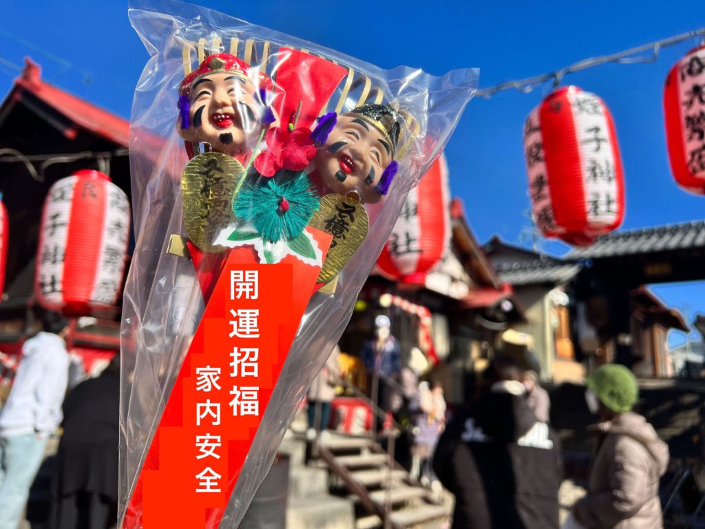 「福や運を鷲掴みする」華やかな熊手が青空に映えます✨