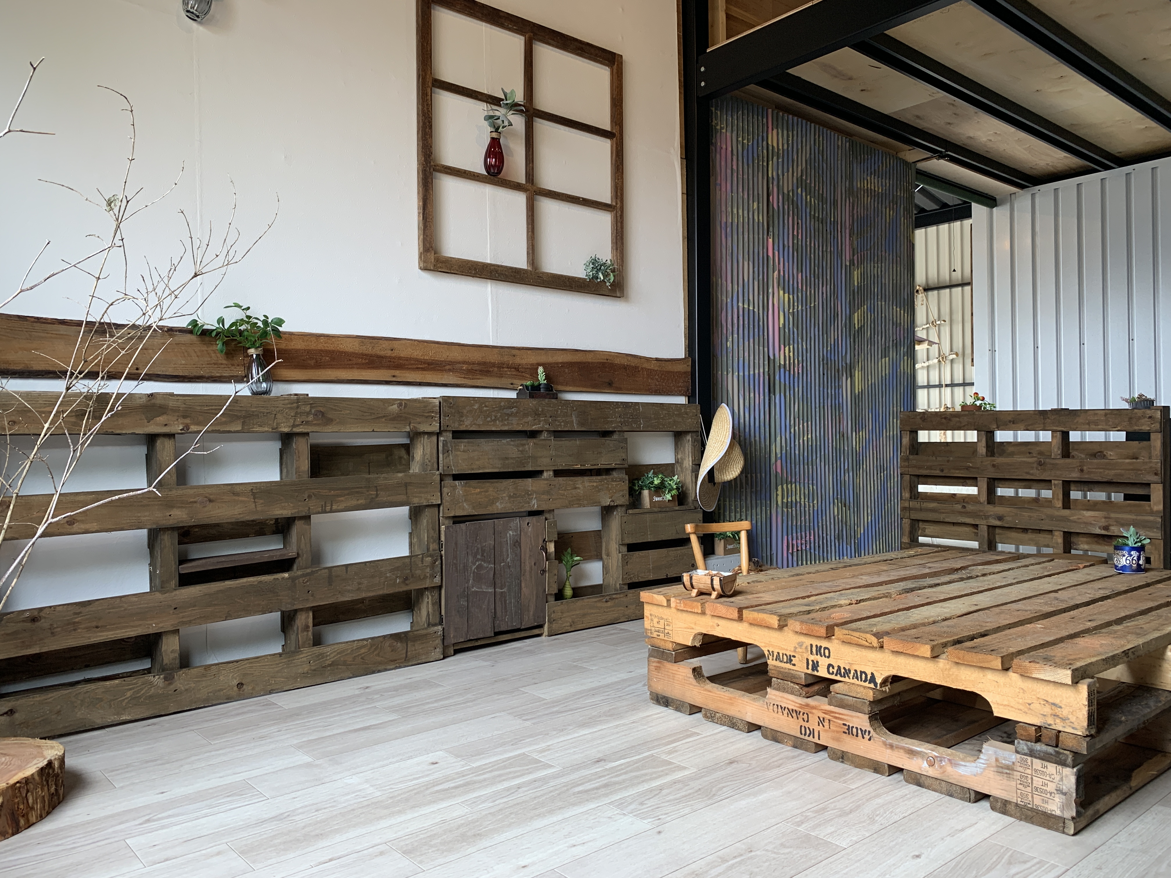 トタン・窓枠・パレットなど・・・ディスプレイされている物の多くは顧客様からのいただき物です。