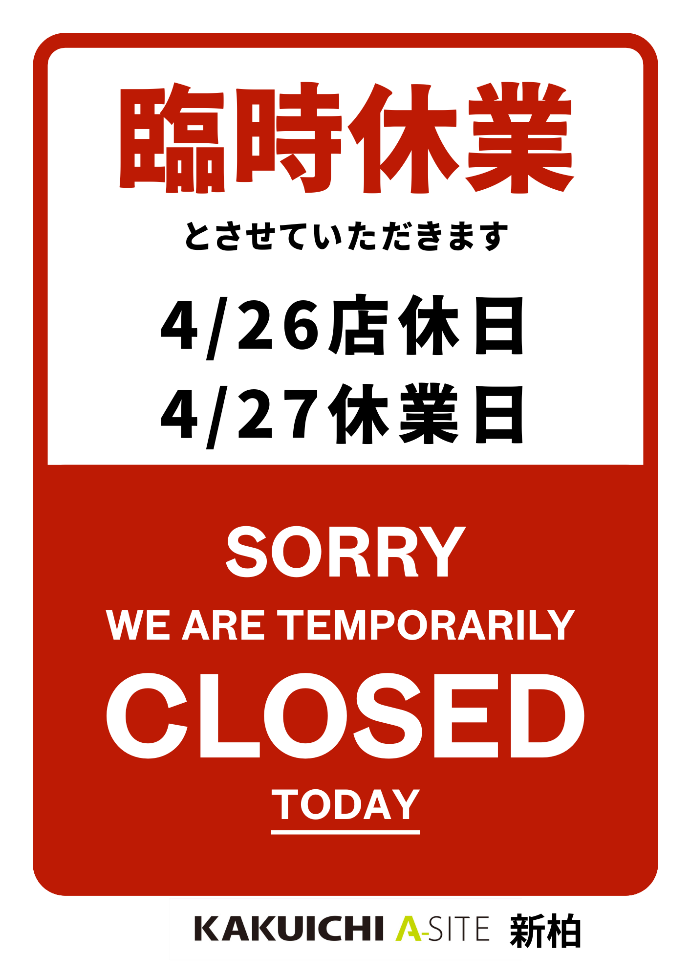 4/26日曜定休日・4/27臨時休業のお知らせ
