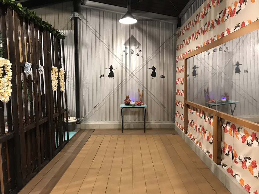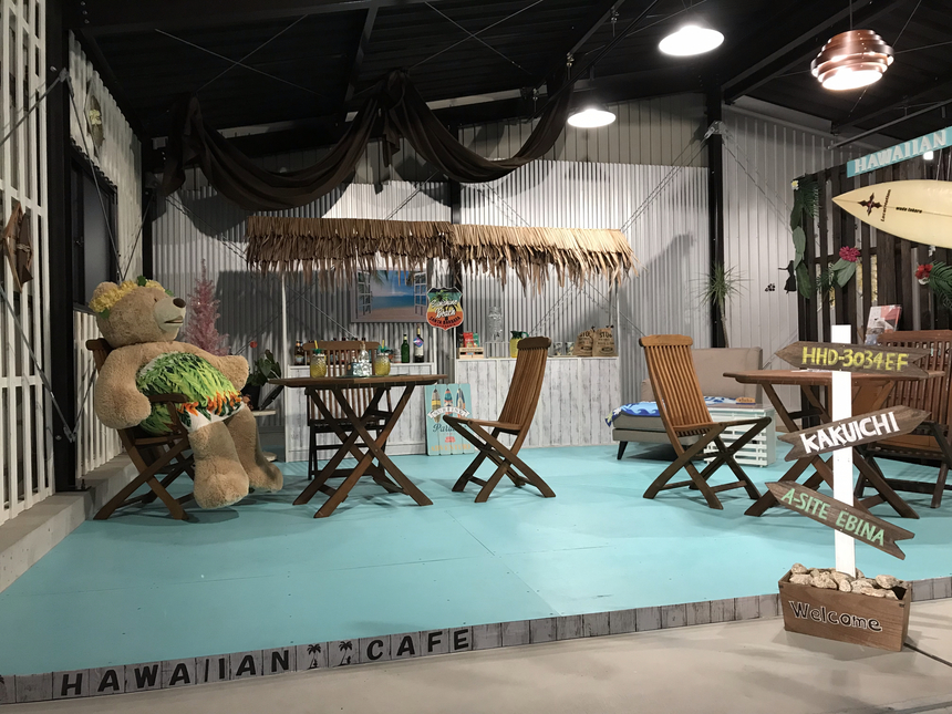 シンボルツリーの椰子の木からイメージを膨らませハワイアンカフェを自分達でDIYをしてみました。