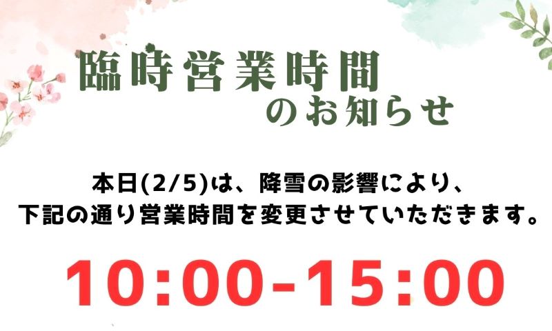 本日2月5日(月)は降雪の影響により下記の通り営業時間を変更させていただきます。