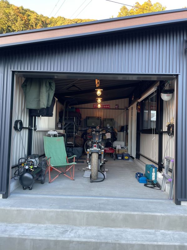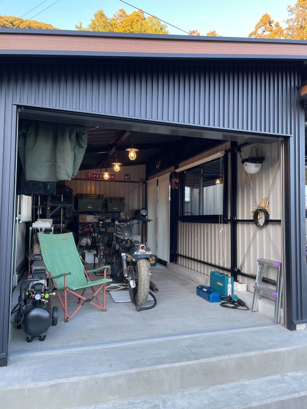 趣味のキャンプ用品やバイクが並びまさに男のガレージ!