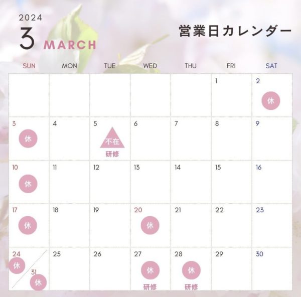 祝日や研修があり、お客様にはご迷惑をおかけいたします。
