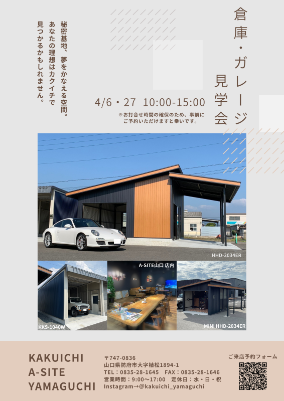 今月もA-SITE山口にて、倉庫・ガレージ見学会を開催します