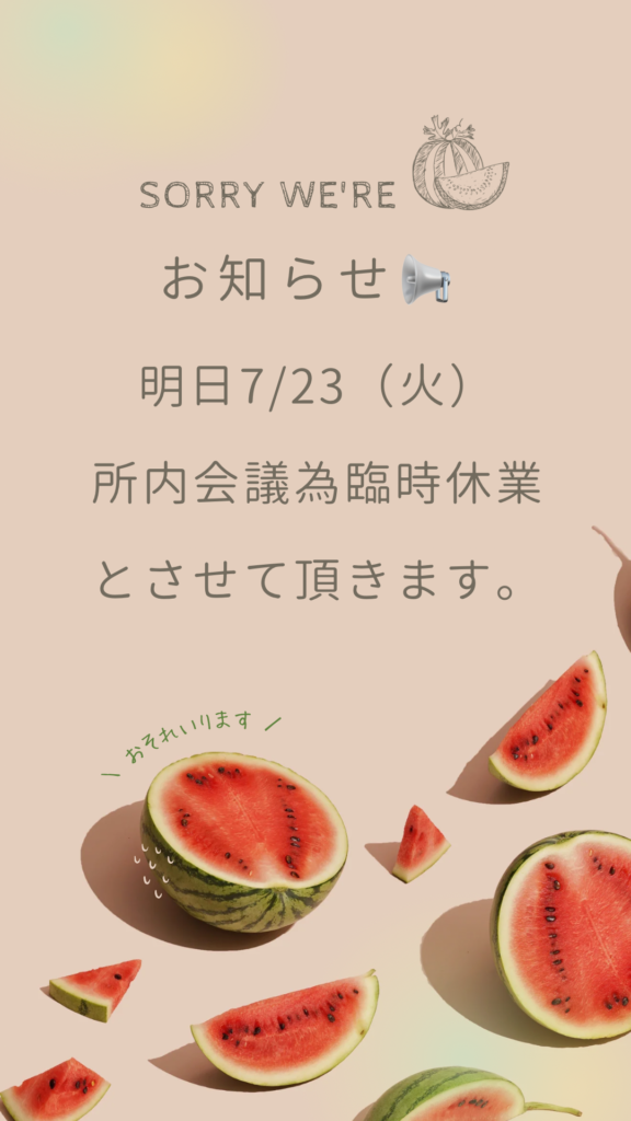 そして明日7/23(火)所内会議の為臨時休業とさせて頂きます。