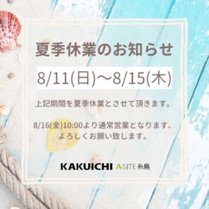 さて、本日は夏季休業のお知らせです。 下記の期間はお休みとなります🌻 お久しぶりの投稿が休業のご案内になってしまいましたが、