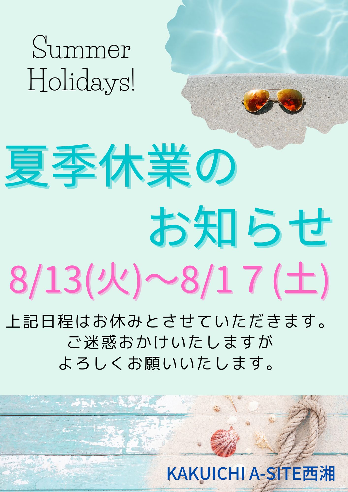 夏季休業のお知らせ🌴 株式会社カクイチ A-SITE西湘は8/13(火)~17(土)までお休みをいただきます