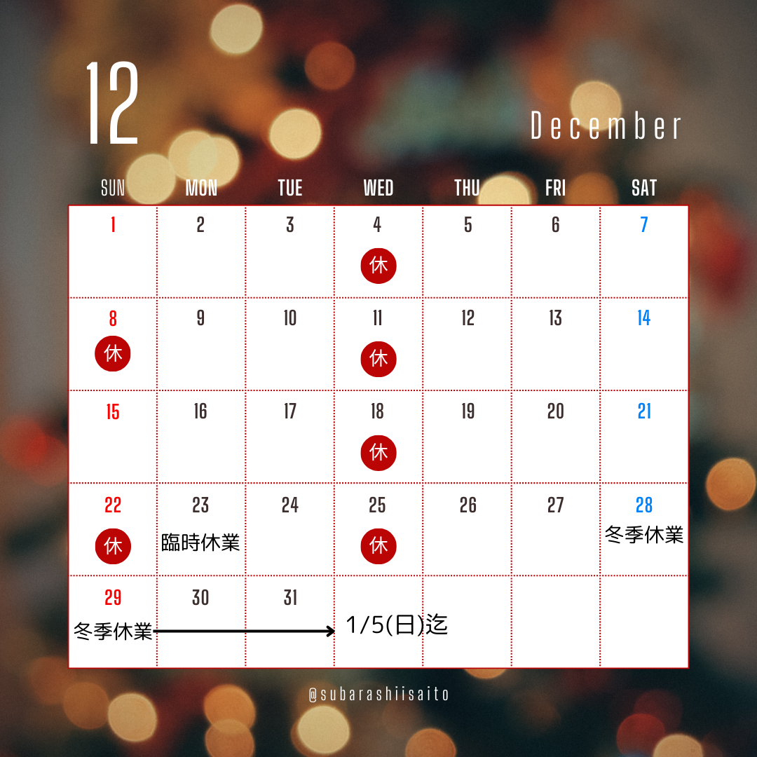 こんにちはAーSITE那須です🍆✨ 12月の営業カレンダーに変更があり再度お知らせです📣🙇♀️ 23日(月)は午前のみ営業予定でしたが所内会議の為臨時休業とさせて頂きます🙇♀️ 又、12/28(土)〜1/5(日)迄冬季休業となりますのでご確認お願い致します🙇♀️