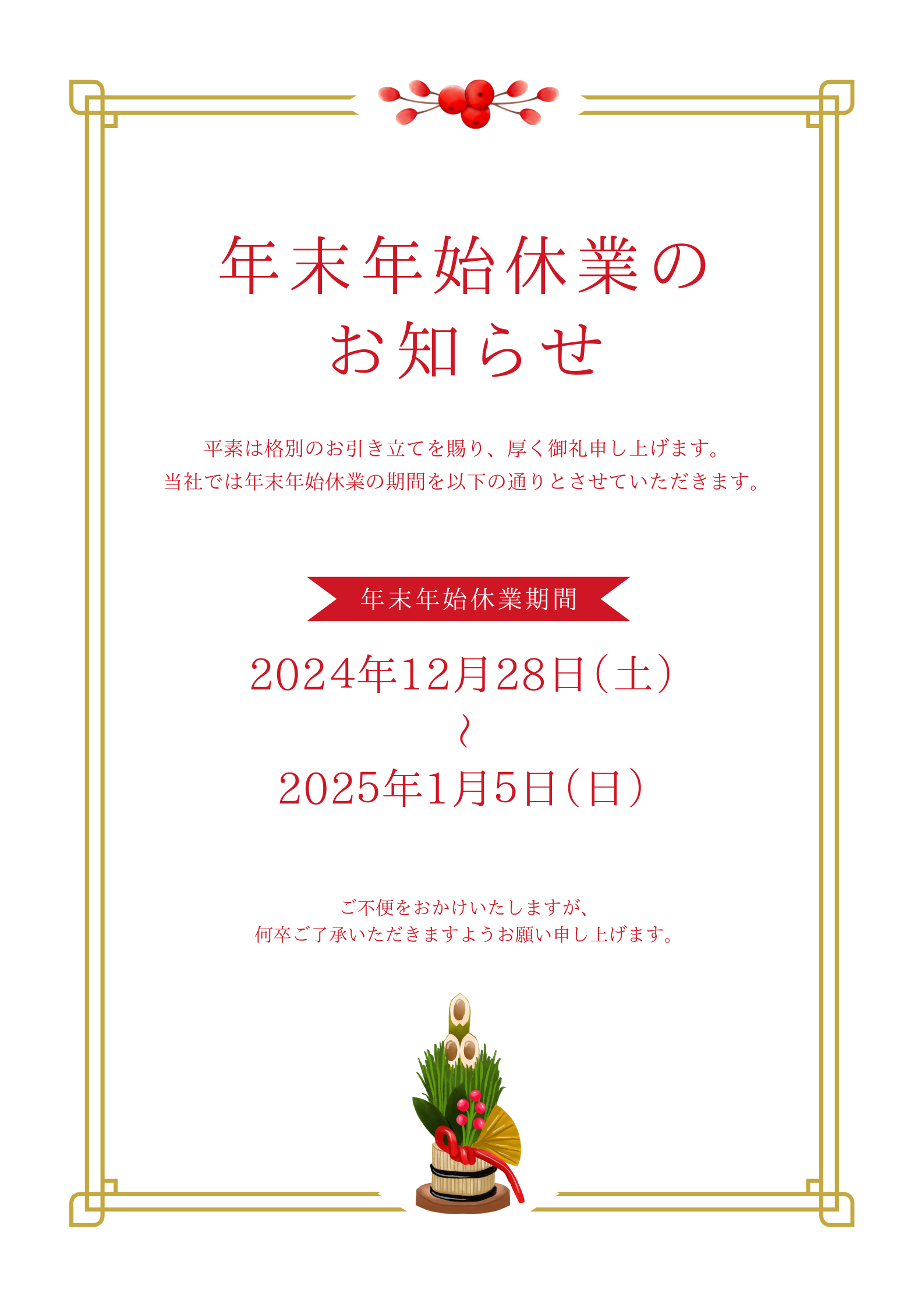 年末は28日から、休業致します。年始は6日から通常通り営業致します。