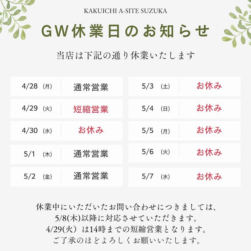 5月1日・2日は元気に営業いたしますのでお問い合わせやご来場お待ちしております🌿