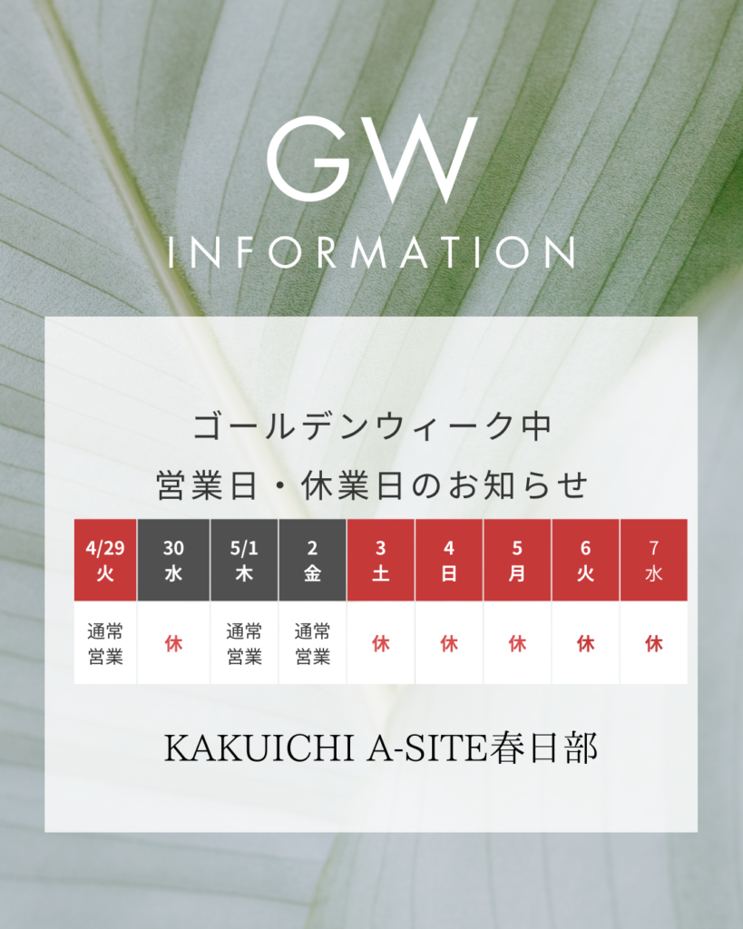 GW休業日のお知らせ🎏KAKUICHI A-SITE春日部