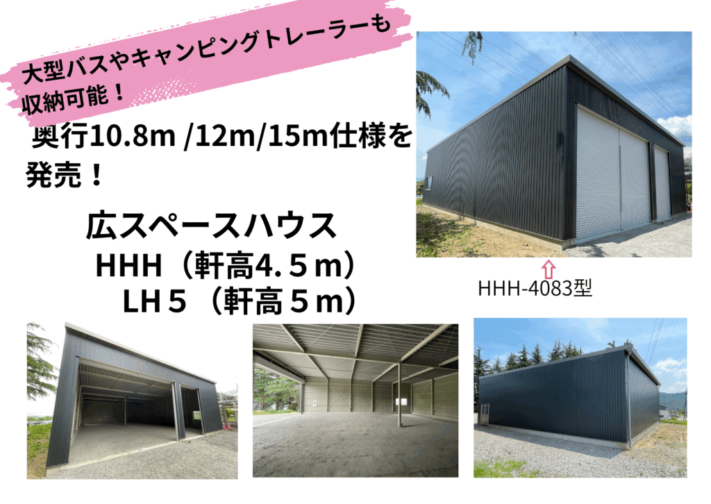 🚩新商品のお知らせ!軒高 4.5m/5mタイプの広スペースハウスに、奥行 最大15mまで対応できる新タイプが登場します!