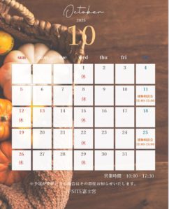 定休日:10/1(水)、10/8(水)、10/12(日)、10/15(水)、10/26(日)、10/29(水)