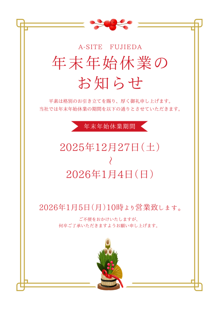 年明けは 1月5日(月)10時より通常営業 いたします!