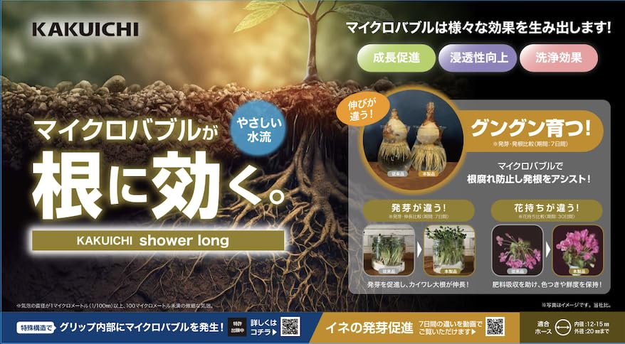 マイクロバブルで、根張りがよくなるだから、グングン育つ!カクイチ シャワーロングは、