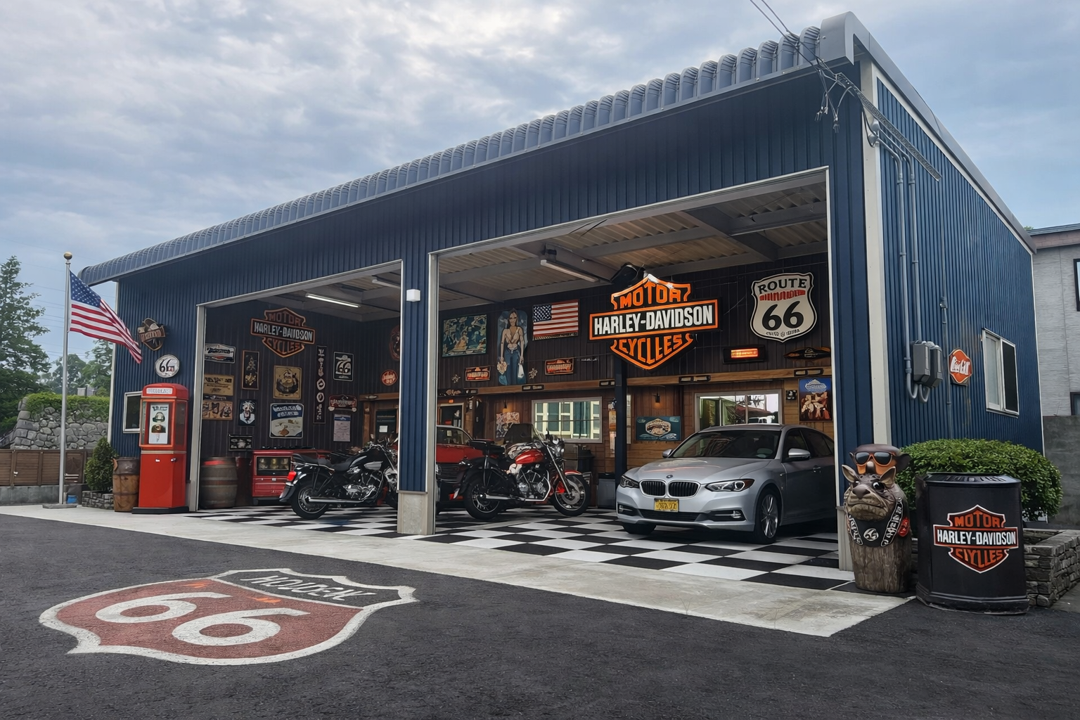 週末、お気に入りのツールボックスを開き、愛車のオイル交換やパーツ交換に没頭する。これこそがガレージライフの醍醐味です。カクイチのガレージは床の耐荷重も十分。重厚なハーレーを複数台並べても安心です。内装をカスタマイズして、アメリカンな看板やネオンを飾れば、そこはもうアメリカ西海岸🏄に!