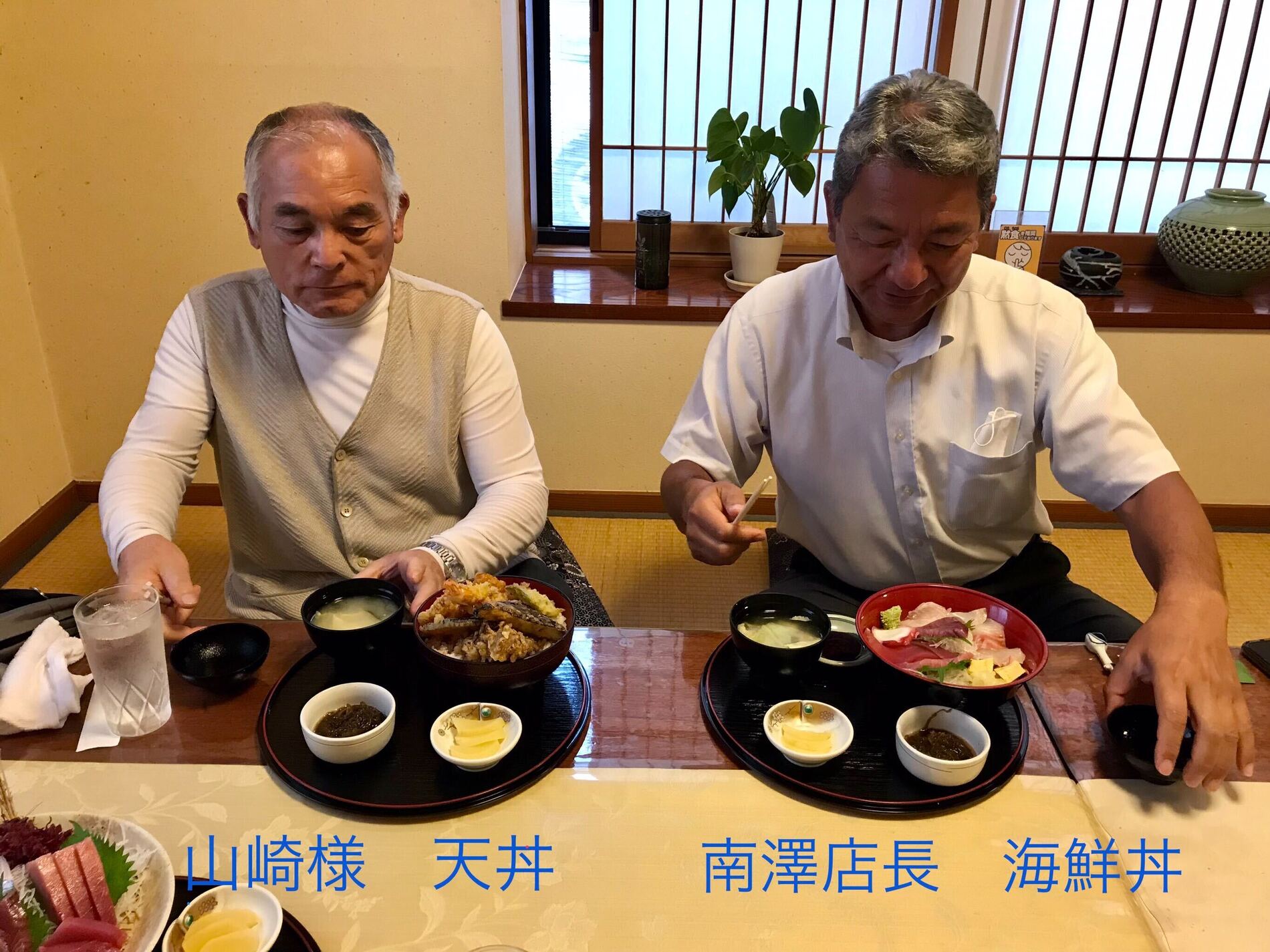 山崎様は天丼、南澤店長は海鮮丼、スタッフNは刺身定食を選択しました。