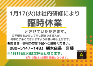 明日17日火曜日社内研修のため栃木店臨時休業とさせていただきます。