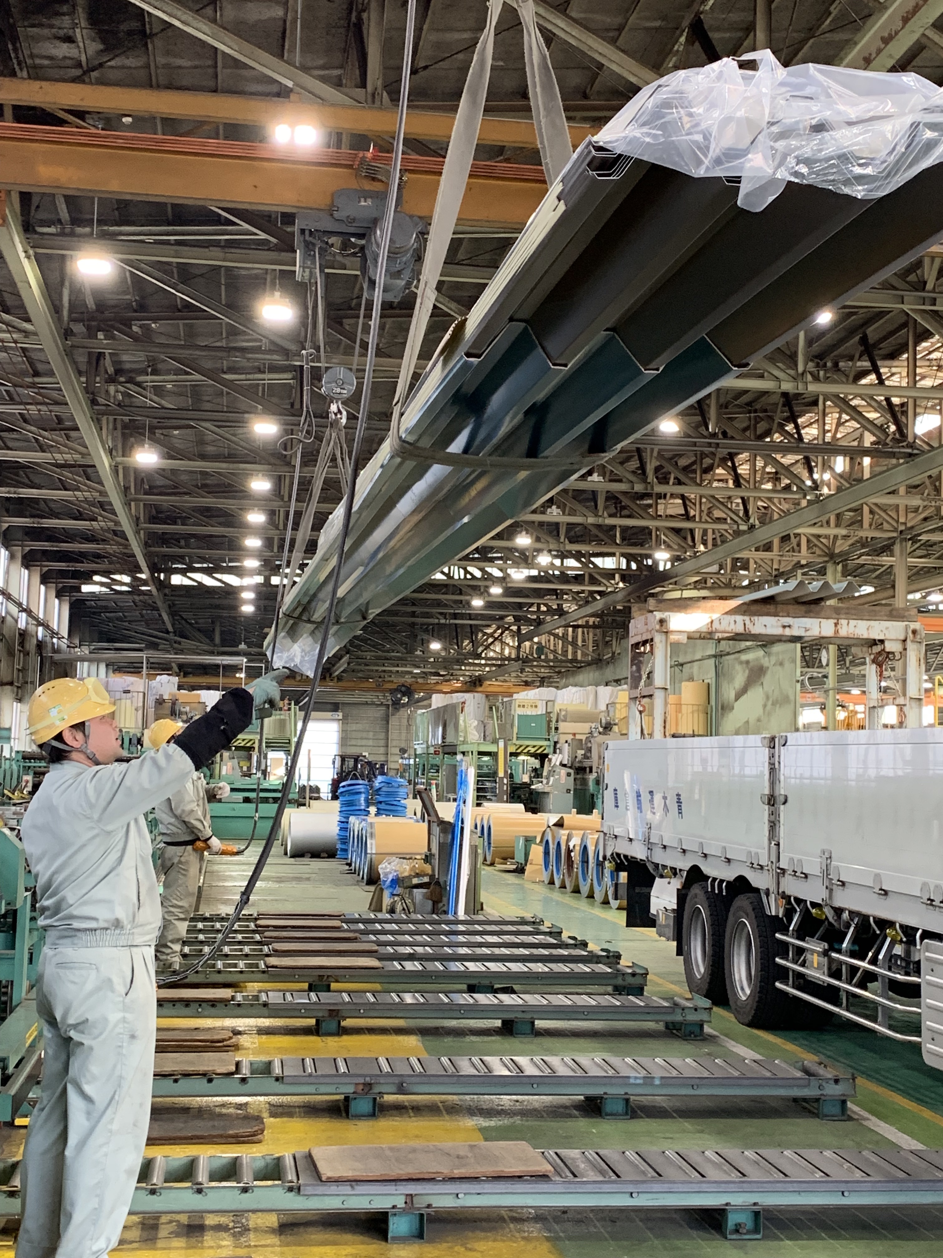 カクイチ倉庫の特徴的な屋根も工場で生み出しています。大型のものになるとクレーンで吊るしてトラックに載せます。外に運び出すのもの一苦労です。近くで見ると物凄く迫力がありますね!