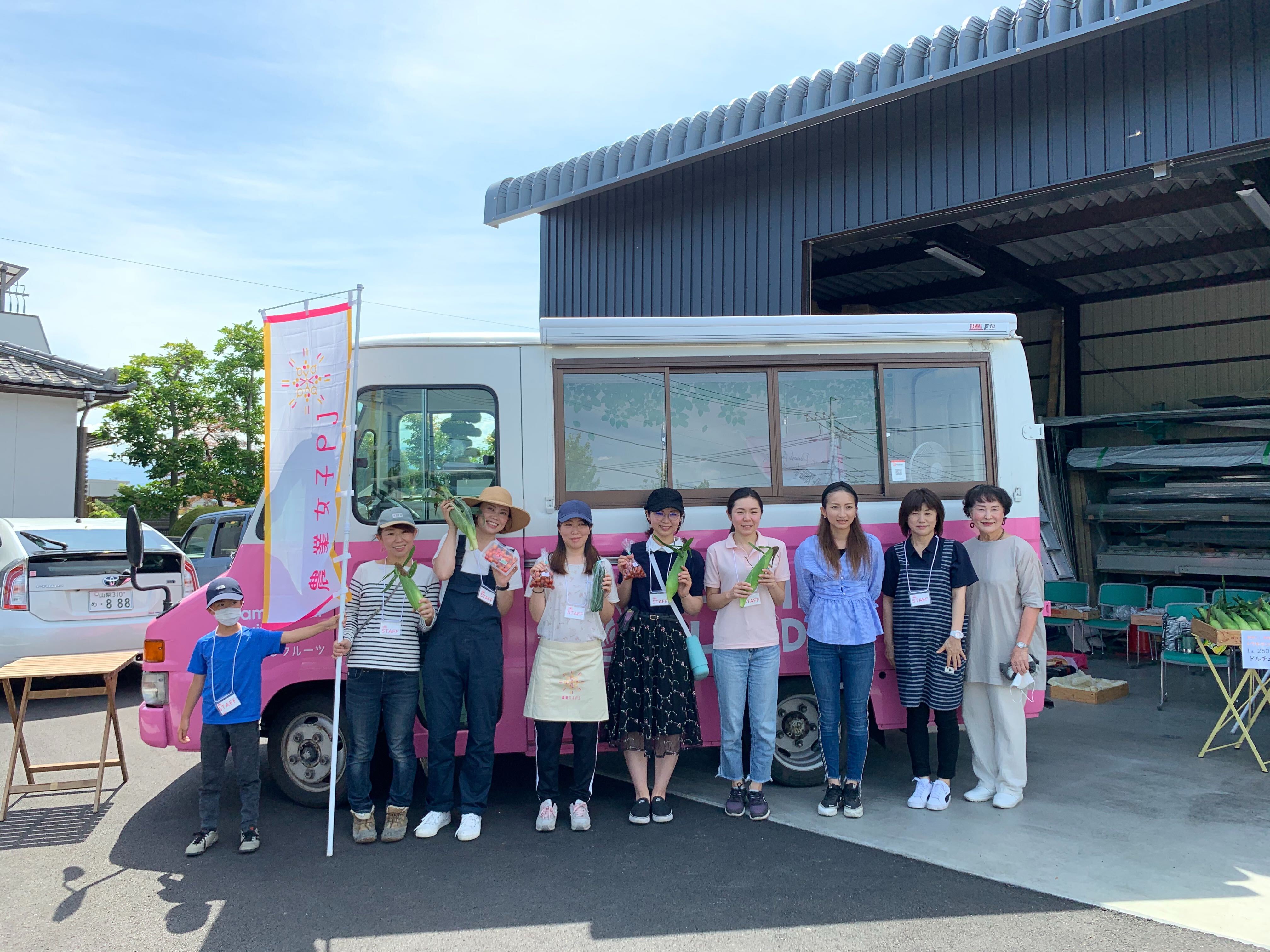 こんな可愛いピンクのバンが目印の「やまなし農業女子」の方々です。