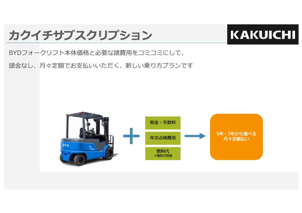 カクイチではBYDフォークリフト本体と必要な諸費用をコミコミにして、頭金なし・月々定額でお支払いいただく新しい乗り方プランをご提案。