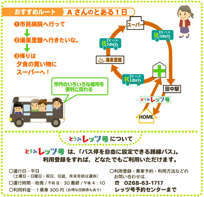 東御市では、誰もが利用しやすい公共交通の仕組みを市民の皆様と検討していくため予約不要な「市内巡回バス」の実証実験を実施します。