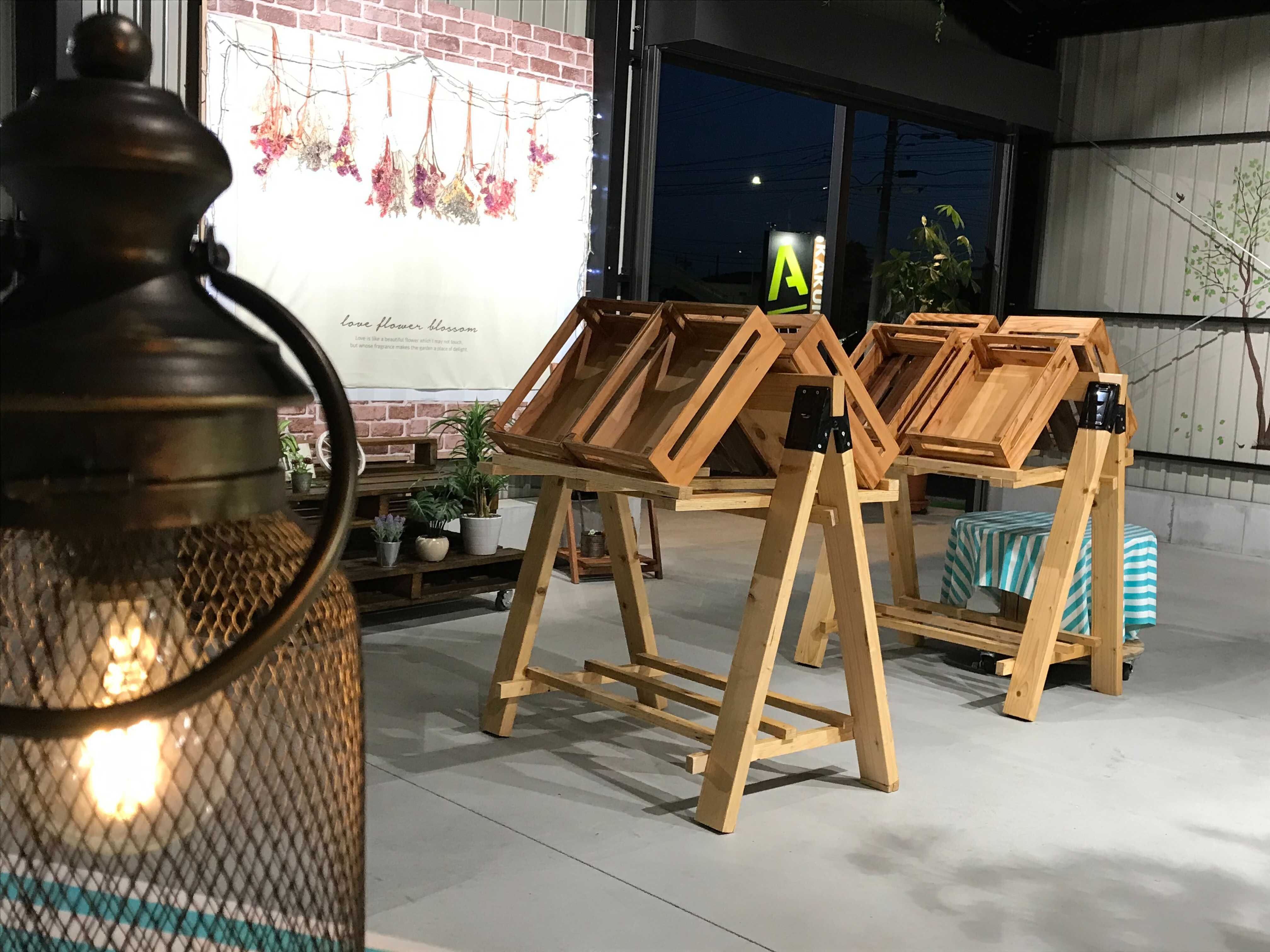 電線ドラムや不用品で棚やカウンターの作成したマルシェブース。