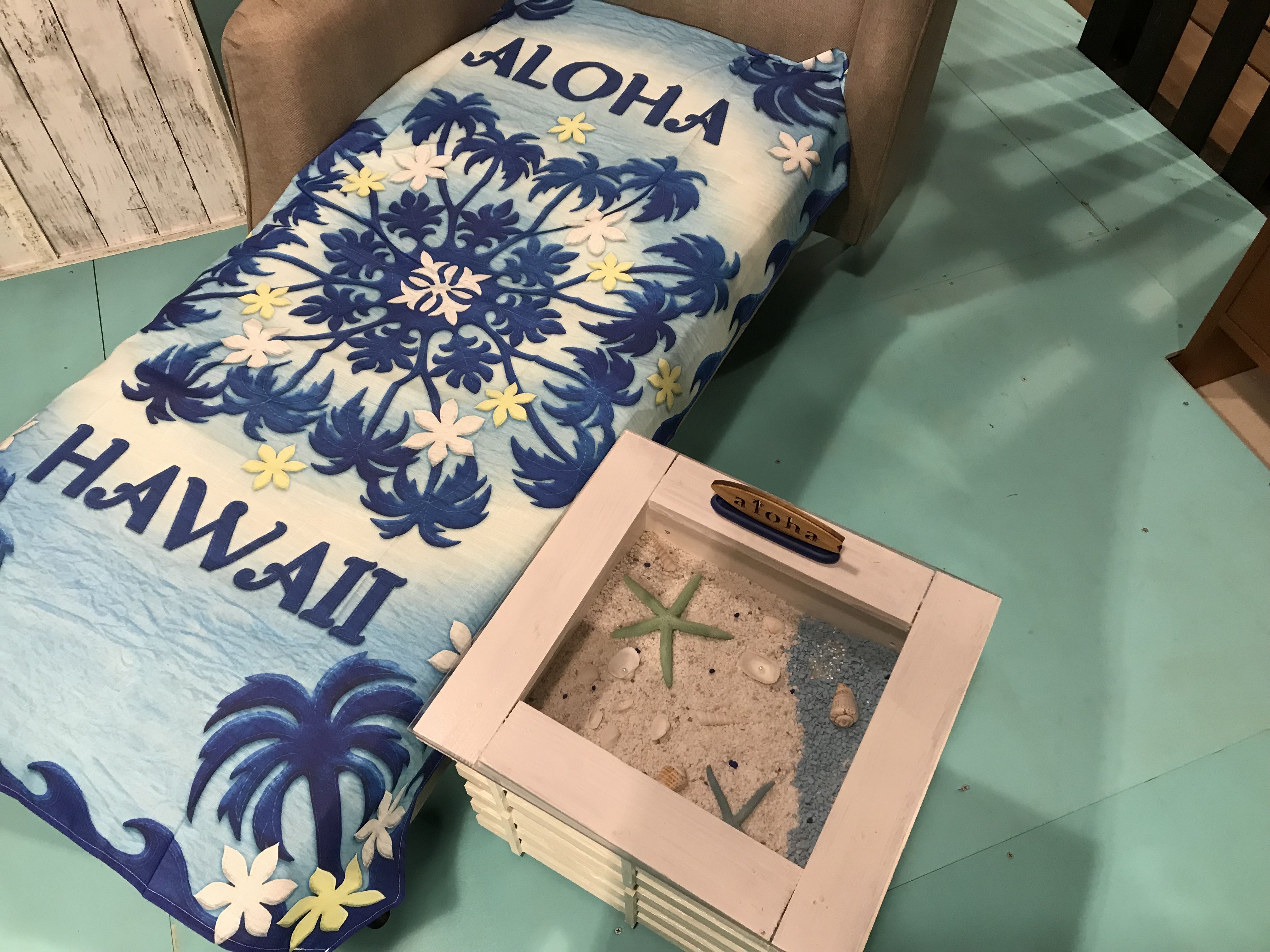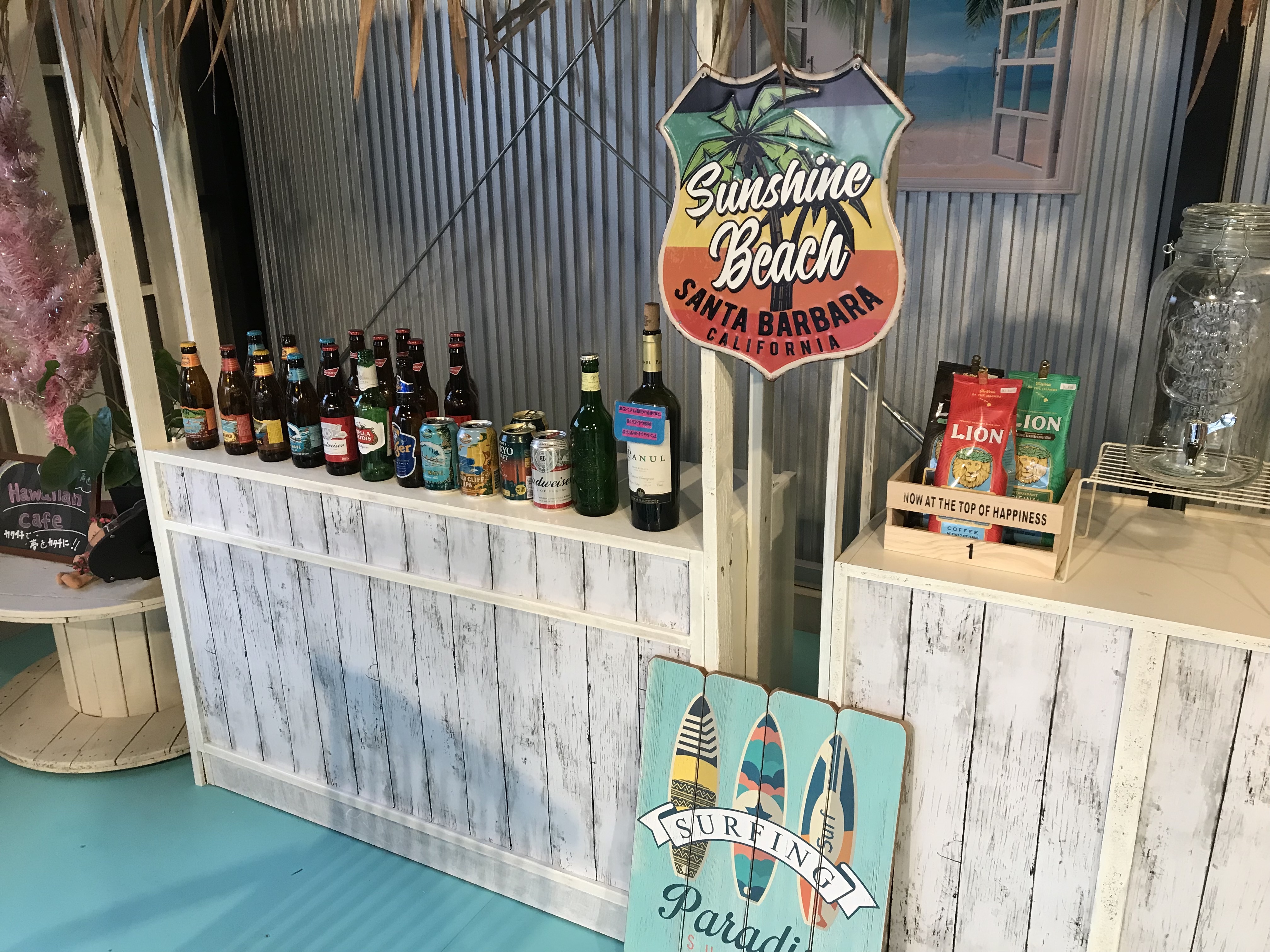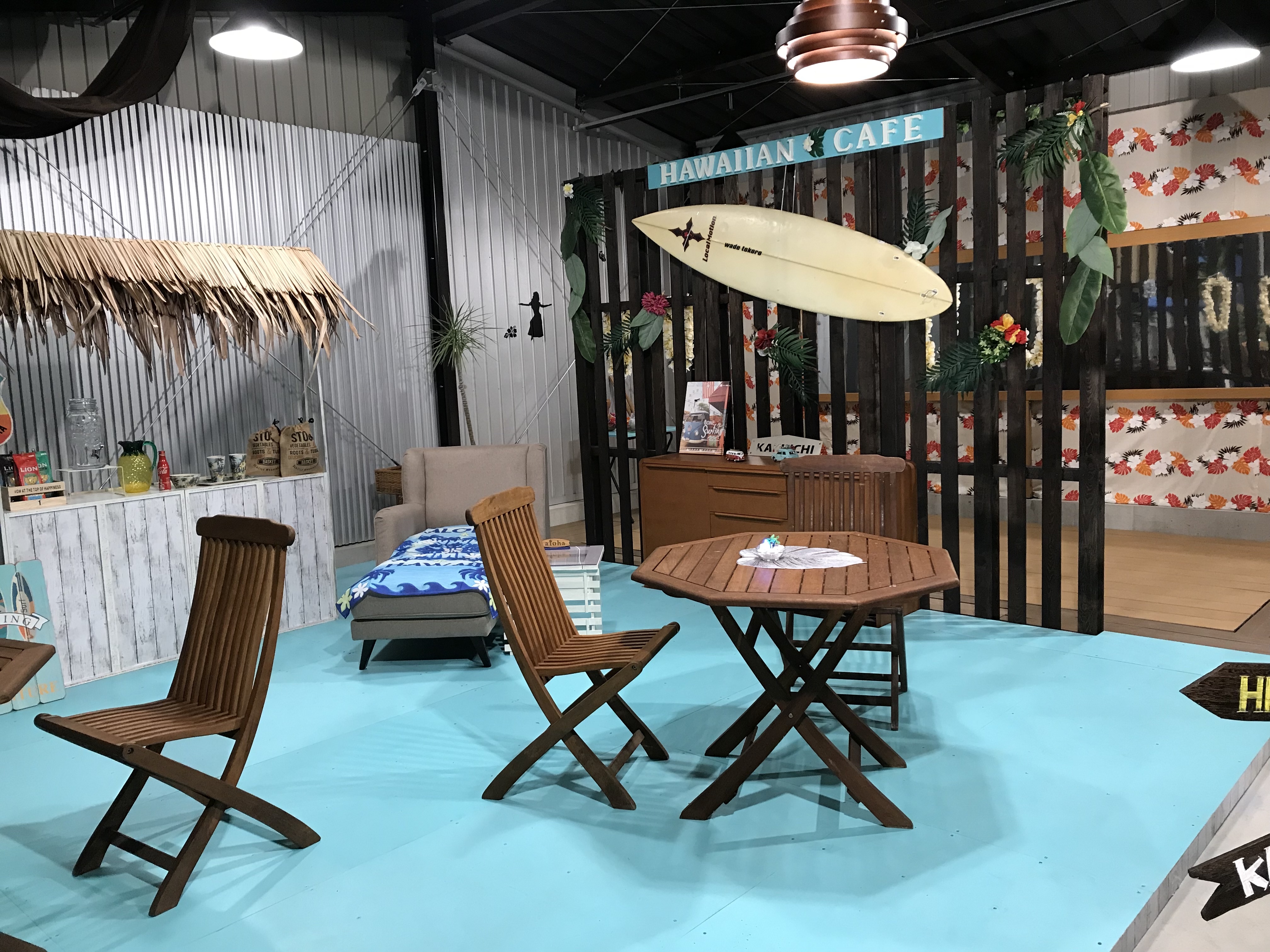 店内は、海の色をベースにエメラルドグリーンや白の配色とハワイ風の小物で室内をまとめ、 お洒落で素敵な空間(場所)をディスプレイしてみました。 さぁ、どうなっているのでしょうか?
