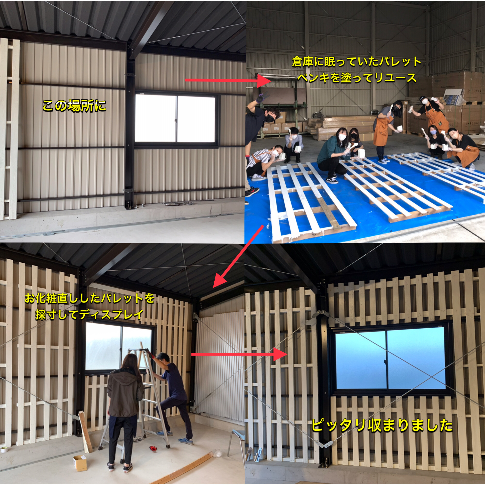 今回のディスプレイは廃材(パレットやカラーBOX・古い木材等)を工夫をして利用し、 自分たちでリメイクしたものがほとんどです。